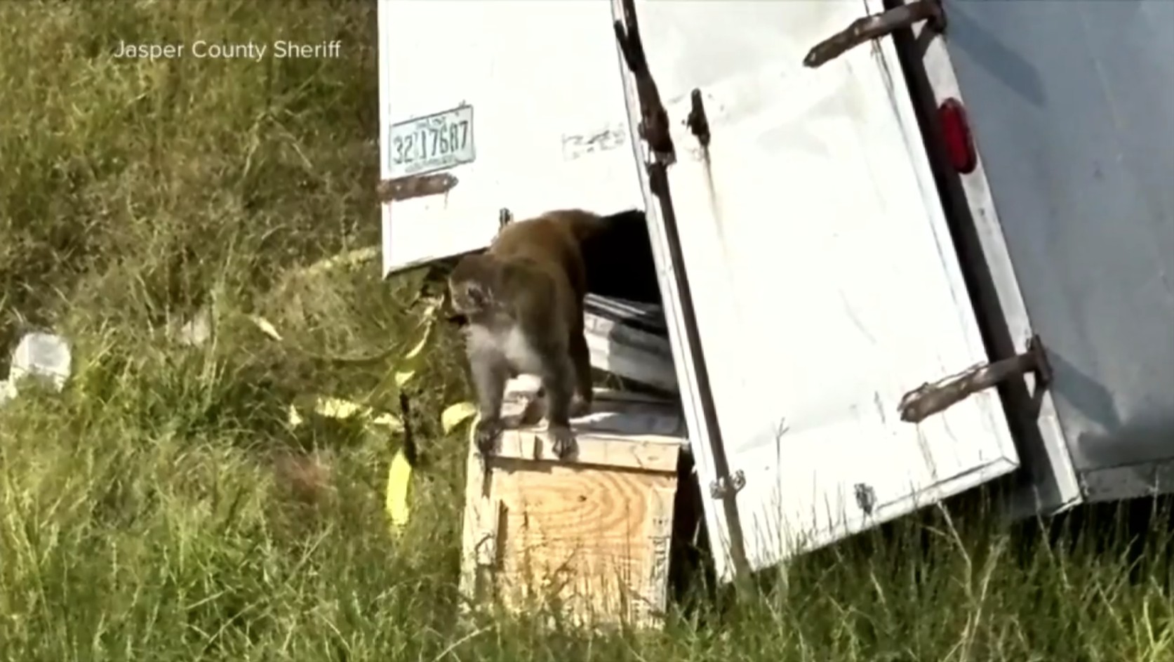 Video footage shows monkeys crawling through tall grass on the side of Interstate 59 just north of Heidelberg, Mississippi. Wooden crates labeled “live animals” were found crumpled and scattered around the crash site.